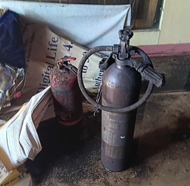 बैंक के मुख्य द्वार पर रखे अग्निशमन यंत्र