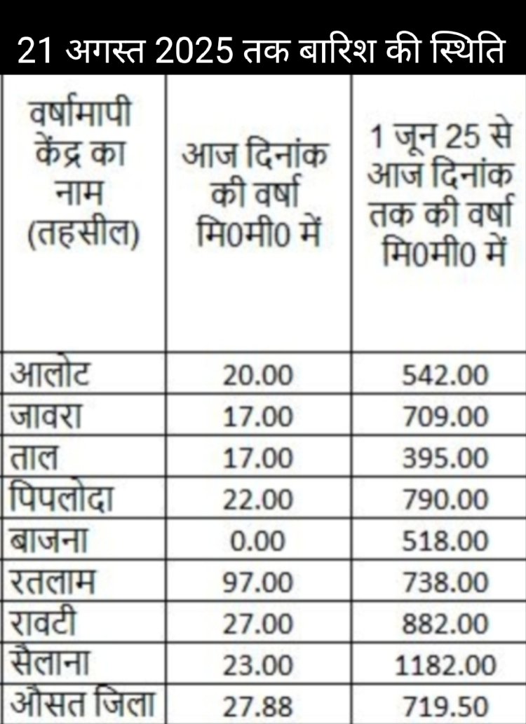 बुधवार को एक बार फिर बारिश का श्री गणेश हुआ। दोपहर बाद मेघ जमकर बरसे। मेघा के बरसाने का क्रम देर रात तक चलता रहा। रतलाम शहर में बुधवार सुबह 8:00 बजे से गुरुवार सुबह 8:00 बजे तक 97 मिमी बारिश दर्ज हुई है जो कि तकरीबन 4 इंच होती है। खास बात यह रही की पूरे जिले में बारिश हुई मगर बाजना इस बारिश से अछूता रहा, वहां पर एक बूंद पानी नहीं गिरा। पिछले 24 घंटे में जिले में औसत रूप से 27.88 मिलीमीटर बारिश दर्ज हुई। गत वर्ष इस अवधि तक 578.38 मिली मीटर बारिश हुई थी जबकि इस बार 719.50 बारिश दर्ज हुई है, जो कि 141.12 मिमी अधिक है।