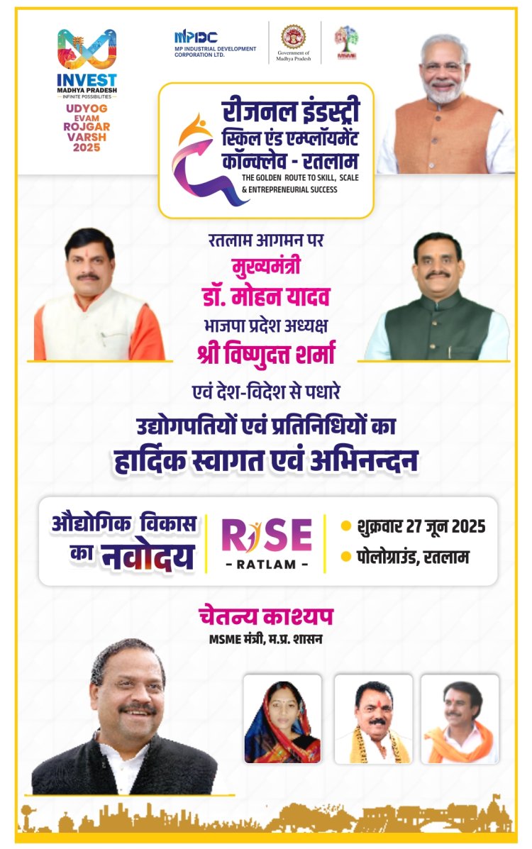 रतलाम 26 जून। शुक्रवार 27 जून का दिन रतलाम के औद्योगिक विकास के लिए ऐतिहासिक होने वाला है। मुख्यमंत्री डॉ. मोहन यादव 27 जून को रतलाम में रीजनल इंडस्ट्री स्कील एंड एम्प्लायमेंट कांक्लेव, (राइज 2025) का शुभारंभ करेंगे। प्रदेश के सूक्ष्म लघु मध्यम उद्यम मंत्री श्री चैतन्य काश्यप तथा अन्य जनप्रतिनिधिगण एवं देश प्रदेश के ख्यात उद्योगपति तथा निवेशक राइज 2025 में उपस्थित रहेंगे।