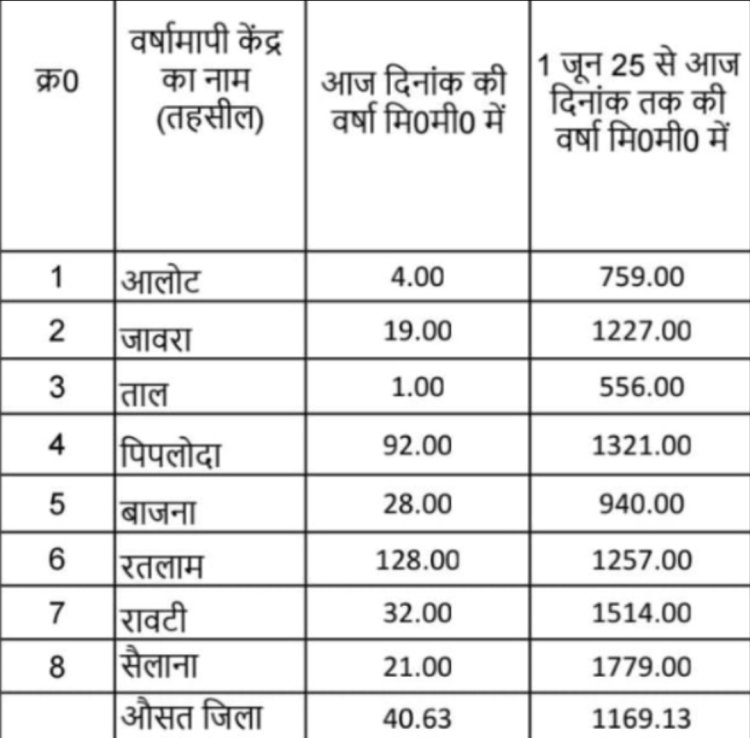 महज ढाई घंटे में 4 इंच बारिश हो गई। वही शाम 5 से शनिवार सुबह 5 बजे तक 12 घंटे में 5 इंच से अधिक बारिश दर्ज हुई। ताल में सबसे कम 1 मिली मीटर बारिश दर्ज हुई। गत वर्ष 6 सितंबर 2024 तक 34.27 इंच बारिश दर्ज हुई थी, वही इस वर्ष 45.84 इंच बारिश दर्ज हुई है जोकि 11 इंच अधिक है।