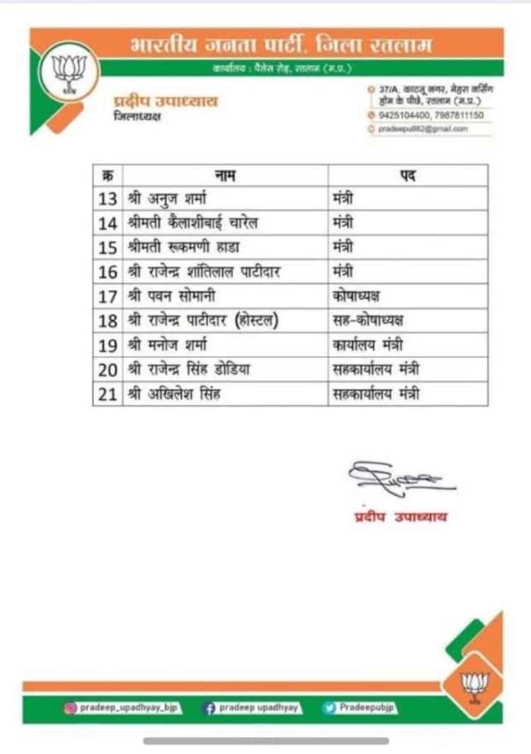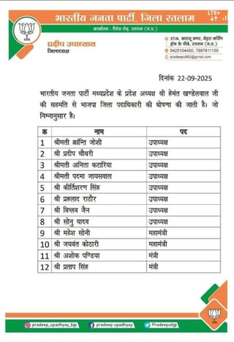 नवरात्रि के पहले दिन नई जिम्मेदारी : रतलाम भाजपा जिला पदाधिकारियों की घोषणा