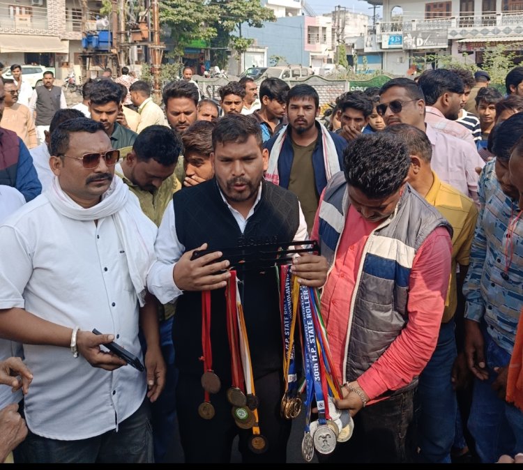 जिला शिक्षा अधिकारी मेडल दिखाते हुए दिनेश माल