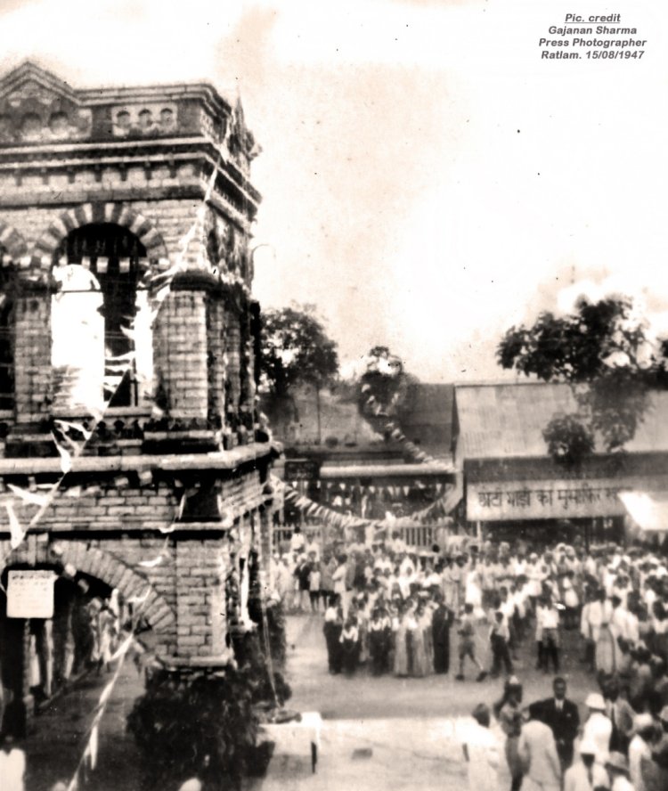 15 अगस्त 1947 का ऐतिहासिक भारतीय राष्ट्र ध्वज का प्रथम झंडावंदन रतलाम रेलवे स्टेशन के मुख्य भवन पर करते हुए रतलाम के तत्कालीन डिस्ट्रिक्ट ट्रैफिक सुपरिंटेंडेंट। इस ऐतिहासिक क्षण को कैमरे से कैद करने का सौभाग्य प्रसिद्ध फोटोग्राफर माय डियर गजानन शर्मा को मिला। (जैसा की प्रेस फोटोग्राफर लगन शर्मा ने बताया)