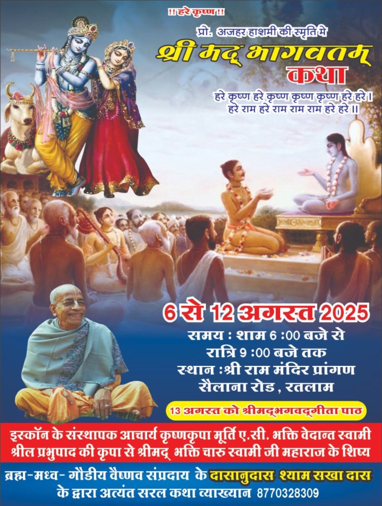 कथा का रसपान अंतरराष्ट्रीय कृष्णभावनामृत संघ (इस्कॉन) के दासानुदास श्यामसखा दास कराएंगे। 12 अगस्त तक चलने वाली यह कथा गीता मनीषी, संत परम्परा के वाहक एवं भारतीय संस्कृति के अध्येता, ओजस्वी वक्ता, प्रखर लेखक, साहित्यकार एवं प्रवचनकार सूफी संत स्व. अजहर हाशमी को समर्पित रहेगी।