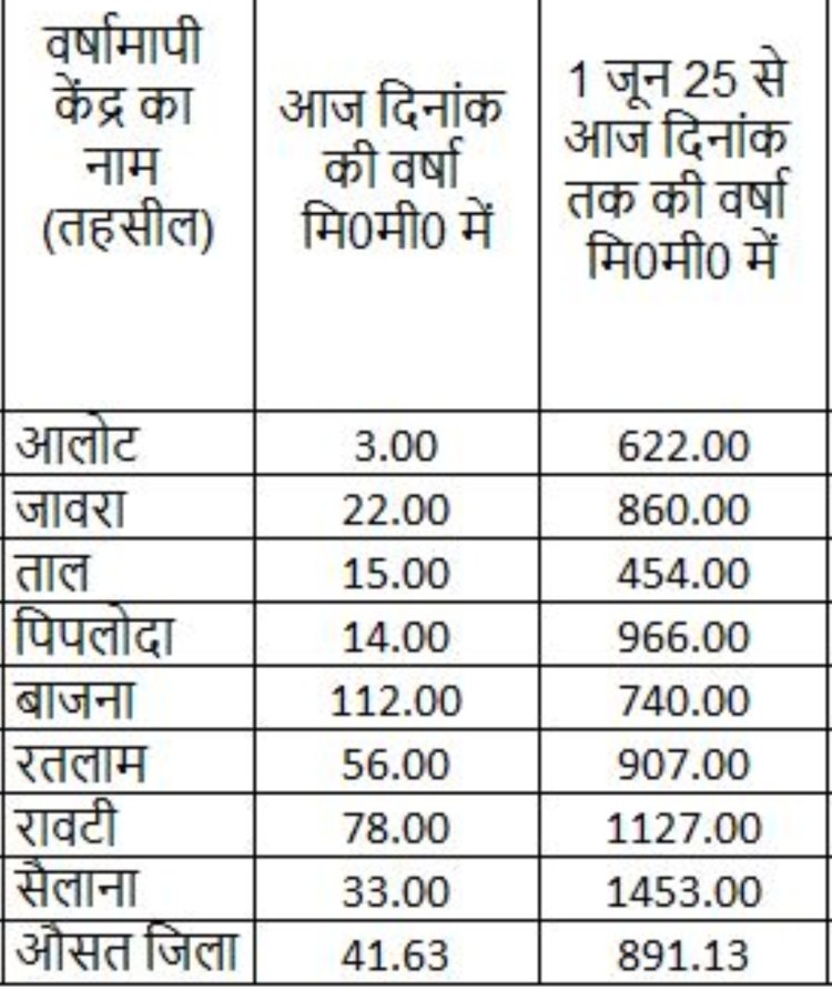 गजानन गणपति स्थापना महोत्सव के पहले दिन ही इंद्र देवता की मेहरबानी के चलते जिला तर बतर हो गया। सर्वाधिक बारिश बजाना में 112 मिनी हुई वही सबसे कम 3 मिमी आलोट में दर्ज की गई। वर्तमान मानसून सत्र में जिले में अब तक 891 मिमी औसत बारिश दर्ज की गई है। जो कि 34 इंच से अधिक है।