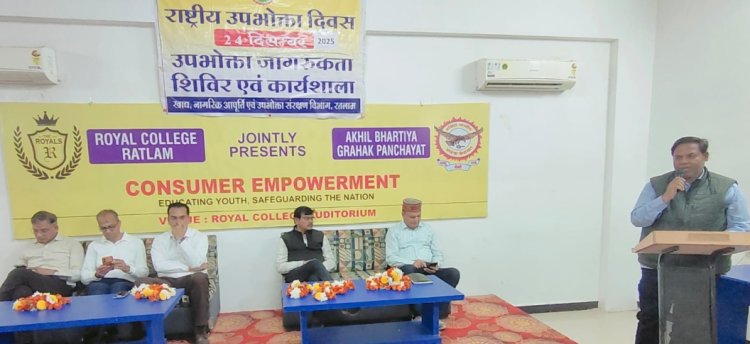 रतलाम, 24 दिसंबर। कलेक्टर कार्यालय (खाद्य) जिला रतलाम के मार्गदर्शन में रॉयल कॉलेज, सालाखेड़ी कैंपस, रतलाम में 'राष्ट्रीय उपभोक्ता दिवस' के अवसर पर एक दिवसीय विस्तृत कार्यशाला एवं जागरूकता प्रदर्शनी का सफल आयोजन किया गया। कार्यक्रम में प्रशासनिक अधिकारियों और अखिल भारतीय ग्राहक पंचायत के विशेषज्ञों ने छात्र-छात्राओं को उपभोक्ता अधिकारों की सूक्ष्म बारीकियां समझाई।